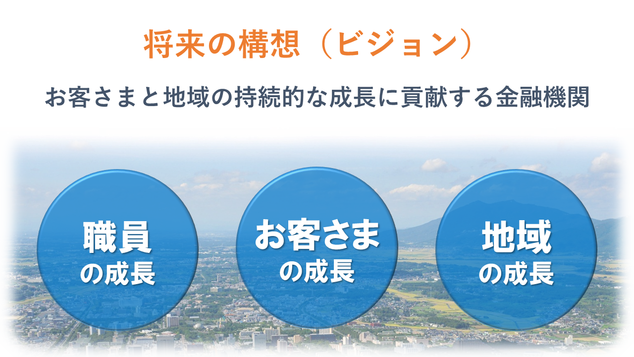 令和7年度より、中期経営計画(2025-2027)がスタートしました。 けんしんでは、3つの基本方針のもと、お客さま・職員・地域の成長の好循環を実現し、地域経済の活性化と持続可能なビジネスモデルを確立させるべく業務に取り組んでまいります。 |